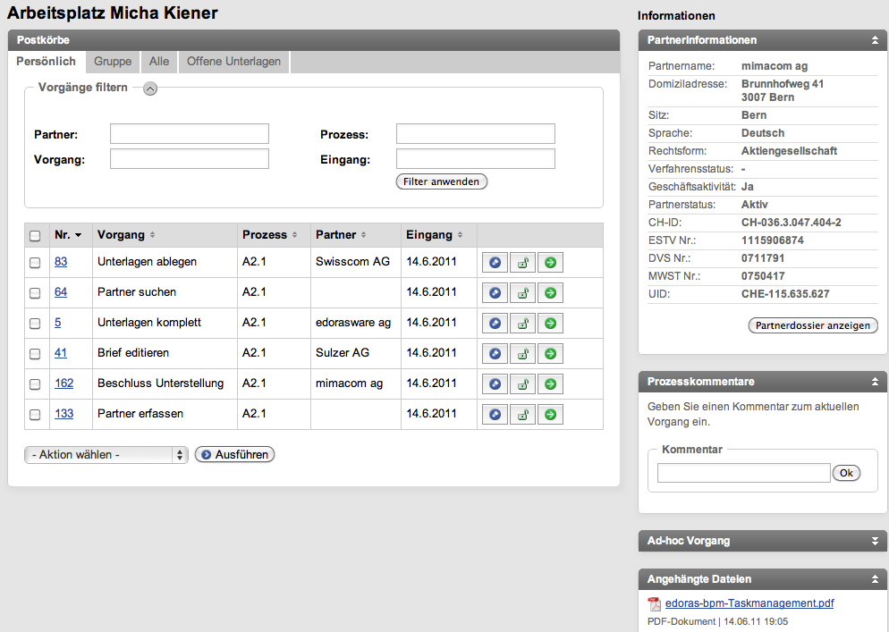 Once processes are defined, the end users will access them easily from their workbasket. The workbasket is the key to obtaining an efficient user interface: its query-based interface enables the user to customize the views to fit them to their actual needs.